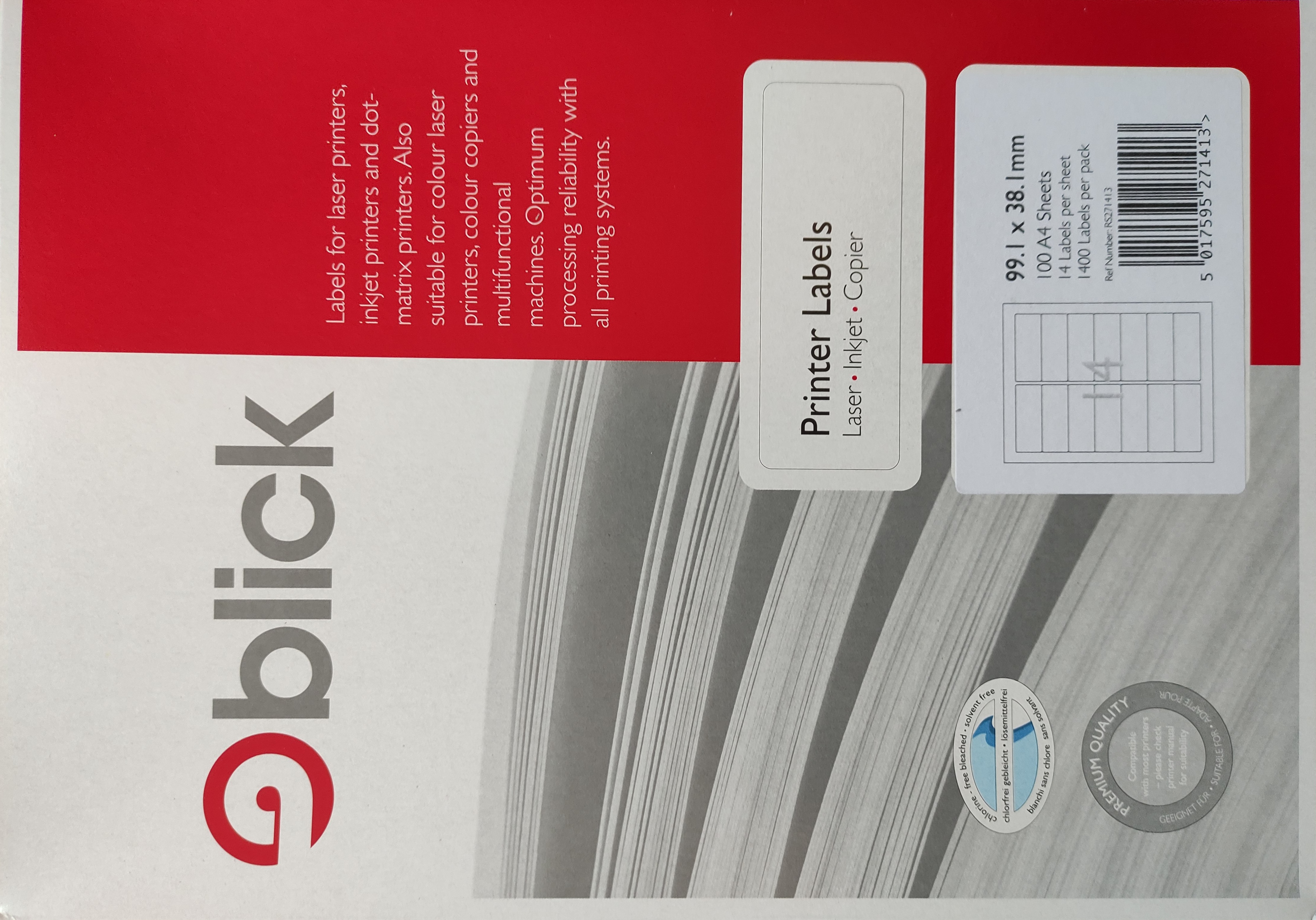 Blick Multipurpose Label 99.1x38.1mm 14 Per A4 Sheet White (Pack 1400 Labels)