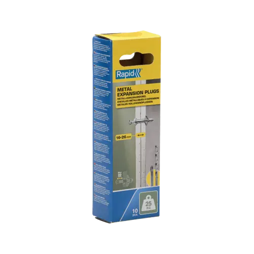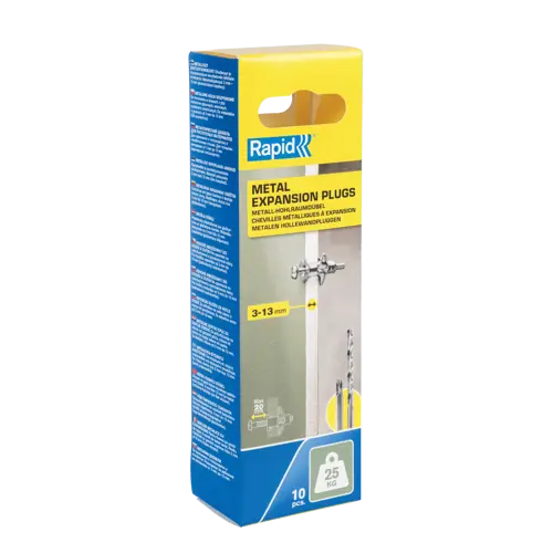 For hanging and fastening versatility, choose Rapid angle-hook, ring-hook and rounded-hook hollow wall anchors. Their various shapes makes them ideal around the home for wall fixing of objects such as lamps, clocks or pictures. Thanks to smart leg design, these hollow wall anchors for plasterboard and cavity walls offer increased gripping surface and high resistance to tearing. They are ideal for single plasterboard, chipboard and fiberboard as well as plastic, metal and laminate sheets with a thickness between 6-16 mm. Our plugs are supplied with a drill in the corresponding size, helping you achieve perfect results. Also, 2 regular screws are included to fix the plug. For fast and effortless installation, use Rapid setting tool XP10, XP20 or XP30..