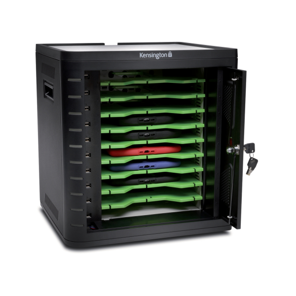 The Kensington Charge & Sync Cabinet is the perfect solution to charge, sync and secure up to 10 iOS or Android tablets. With adjustable drawers, each bay can accommodate tablets in a protective rugged case. A tamper-resistant, retracting front door offers security with customized key access, and the included mounting plate or cable lock keeps the cabinet in place. Up to 3 cabinets can be stacked so you can charge, sync and secure for up to 30 tablets. Add more functionality with wall mounting, mobile wheeled base and Lightning and micro USB charge/sync cables.