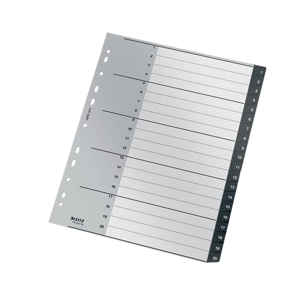 Premium quality extra wide A4 Folder Divider, 1-20 numerical tabs tabs. 90% recycled plastic, climate neutral and 100% recyclable. For clear organisation of A4 documents, helps in keeping track of important notes or school paperwork, for home, school or office use. This robust index perfectly complements other products from the Leitz Recycle range and is made to last. Modern and contemporary green stationery that will look great at home and in the office. With the new eco friendly Recycle range from Leitz you can both improve your office environment – and the environment of our planet. Pack of 10