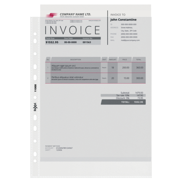 Rexel Budget A4 Pockets are made in lightweight polypropylene and feature a clear reinforcing strip with multi-punched holes to fit most ring binders. They come in packs of 100 and are embossed to reduce glare while the top opening allows easy access to contents placed in a binder. Pack of 100