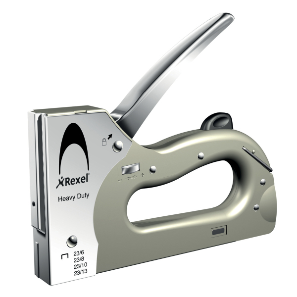 The attractively designed Rexel Heavy Duty Tacker is tough enough for everyday use even on heavy duty tasks. It includes a safety lock handle and uses Rexel 23/6, 23/8, 23/10 and 23/13 staples.