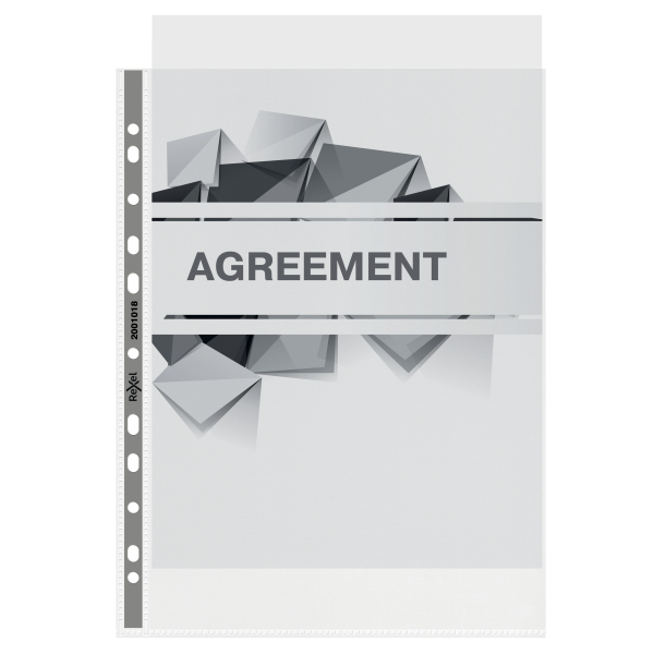 Rexel Nyrex Premium A4 Punched Pocket with Grey Spine Clear . These high quality A4 pockets are ideal for storing presentation material, and photocopies. They feature a grey reinforced spine with a top opening that allows easy access to contents. They can easily and securely hold up to 25 sheets of paper. Made from a medium weight, clear glass plastic that provides extra clarity. Pack of 50 X 2 Packs.