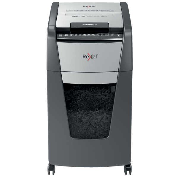 The Optimum AutoFeed+ 300X cross cut shredder automatically shreds up to 300x A4 sheets of paper (80gsm) at a time, into P-4 (4x25mm) cross cut pieces. This auto feed shredder machine is a sophisticated office shredder, featuring a 60 Litre pull out bin. No need to manually feed paper, or remove staples and paper clips first, this automatic paper shredder will do all the work for you.