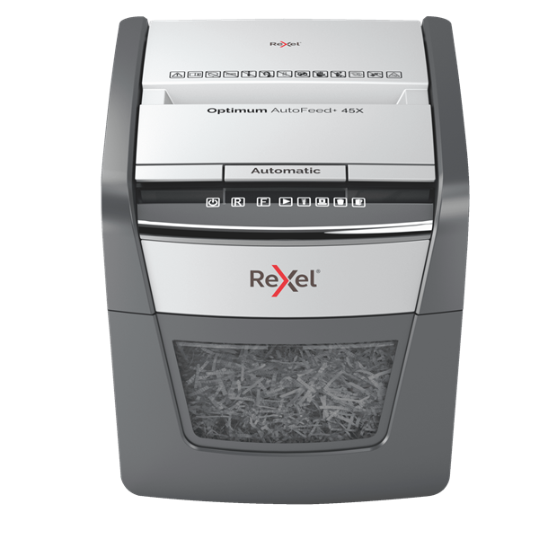 The Optimum AutoFeed 45X cross cut shredder automatically shreds up to 45x A4 sheets of paper (80gsm) at a time, into P-4 (4x28mm) cross cut pieces. This auto feed shredder machine is ideal for use as a home or home office shredder due to its compact 20 Litre bin. No need to manually feed paper, or remove staples and paper clips first, this automatic paper shredder will do all the work for you.