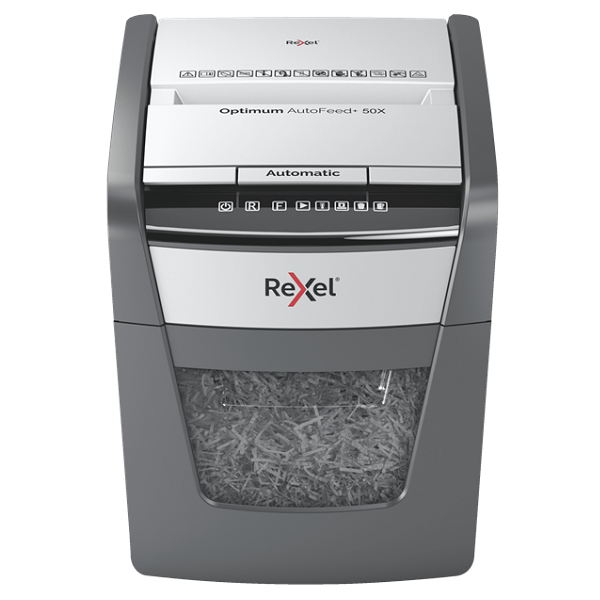 The Optimum AutoFeed+ 50X cross cut shredder automatically shreds up to 50x A4 sheets of paper (80gsm) at a time, into P-4 (4x28mm) cross cut pieces. This auto feed shredder machine is ideal for use as a home or home office shredder due to its compact 20 Litre bin. No need to manually feed paper, or remove staples and paper clips first, this automatic paper shredder will do all the work for you.